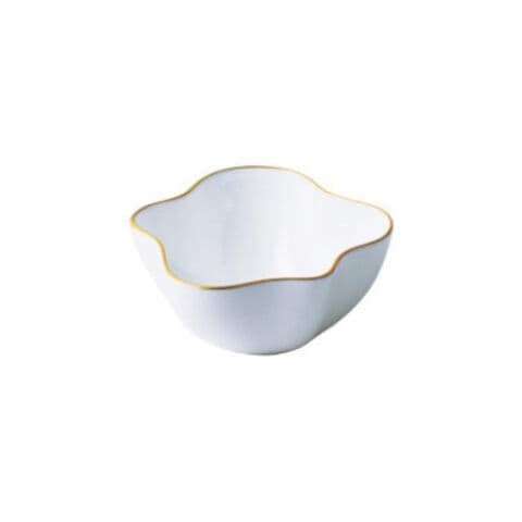 | 花のかたちの小さなボウル(満水時容量約270cc)です。小鉢としてお使いいただけます。豪華な金色の縁取りが、より洗練された印象を与えます。 真っ白なボーンチャイナに映える華やかな金が、食事の場をより楽しく華やかなものに変えるでしょう。 |