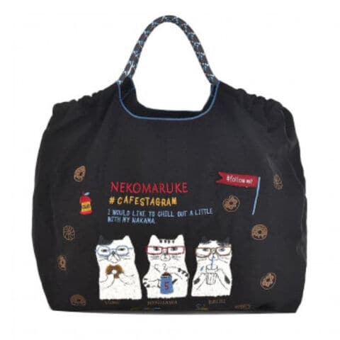 クスグルジャパン 撥水加工 刺繍ワッシャーバッグ Lサイズ ネコまるけ柄 クロ 24-7153