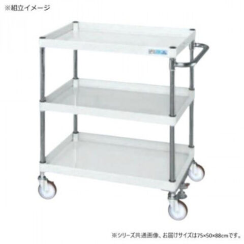 | 仕様 | 外寸:W750×D500×H880mm 均等耐荷重:150kg 本体色:パールホワイト 質量:23kg キャスター:100φサイレントエラストマー車 段数:3 組立式 |