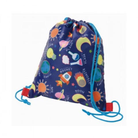 | ワクワクが詰まったサイエンス柄のナップザックです。イラストと英単語が書いてあるので、英語の勉強にも。 |