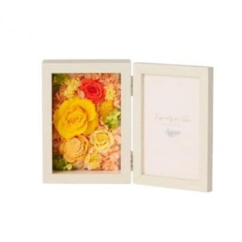 | バラとあじさいの小花がフェミニンな印象のフォトフレーム型のアレンジです。メッセージカードを入れて贈り物にもぴったりです。 |