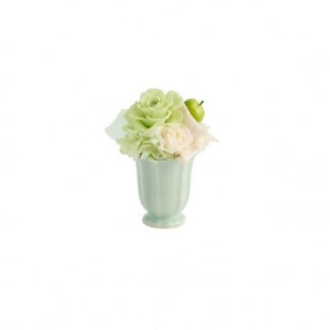 | お花に合わせたカラーの器と青リンゴで爽やかさを加えたかわいらしいアレンジメントです。 |