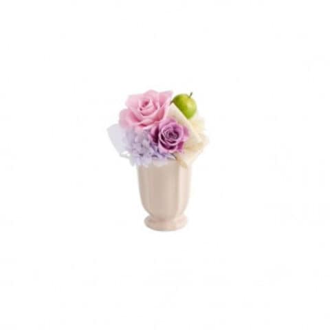 | お花に合わせたカラーの器と青リンゴで爽やかさを加えたかわいらしいアレンジメントです。 |