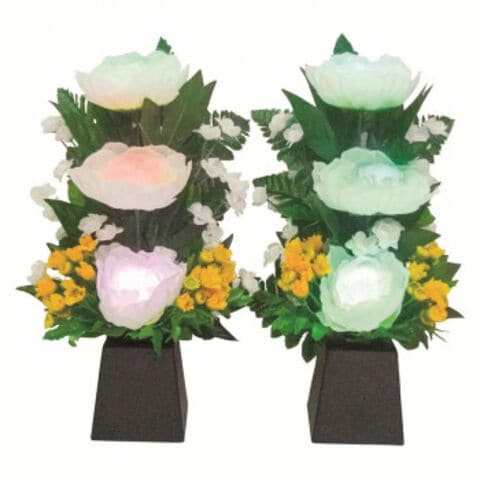 | LED電球で7色に変化するタイプの仏花は、現代的でユニークな特徴です。電池式でコードレスである点は、設定場所の自由度を高めるので便利です。仏壇の伝統的な厳かな雰囲気を保ちながらもLEDライトの色変化が加わることで、華やかさや癒しを演出できます。日々のお供えが手軽になるだけでなく、新しいスタイルの仏間の彩りとして多くの人に受け入れられます。 |