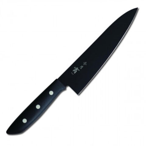 | シリコンフッ素で刀身を黒く塗装したシックな色合いの包丁です。ハンドルには軽量で手に馴染む形状を採用しました。 |