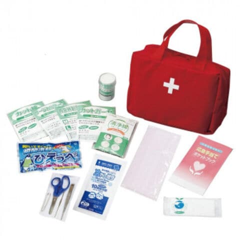 | セット内容 | 救急バッグ、カット綿×3枚、カットガーゼ×3枚、包帯、救急絆創膏2サイズ×3枚、サージカルテープ、清浄綿2枚入×3包、ハサミ、ピンセット、耳かき、毛抜き、熱救急シート2枚、冷却パック、ECO便利バッグ、マスク、応急手当ポケットブック |