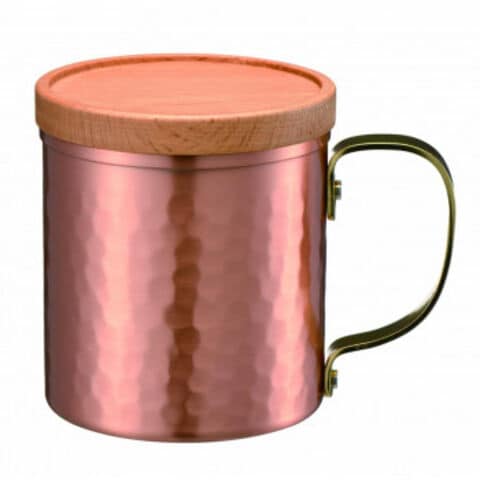 鎚目模様のシックなデザインの銅製マグカップ。ジントニックやモスコミュール、アイスコーヒーを飲むのに最適なアイテム。木製の専用蓋付きです。