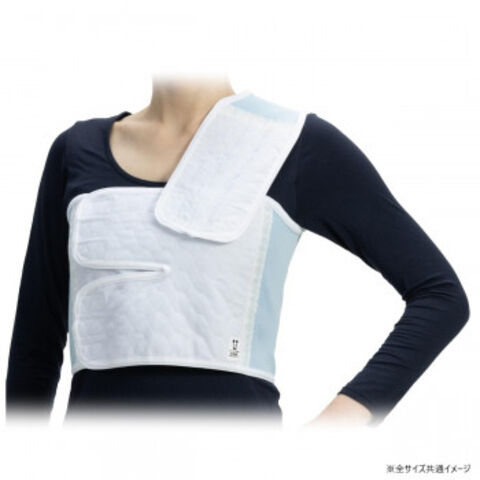 | 2つに分かれた留め部で調整でき、肩バンドも付いてズレにくくなっています。伸縮素材で体にフィットし、厚手生地でしっかり固定してくれるので安心です。綿が主体のソフトな肌ざわりで、やさしく保護します。 |