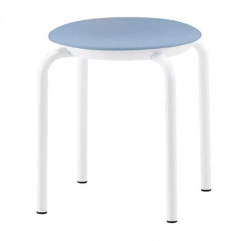 | キャスターはありません。抗菌・防汚・難燃・耐次亜塩素酸・耐アルコール機能対応張地の丸椅子です。4脚までは平積み可能です。 |