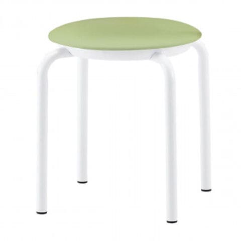 | キャスターはありません。抗菌・防汚・難燃・耐次亜塩素酸・耐アルコール機能対応張地の丸椅子です。4脚までは平積み可能です。 |