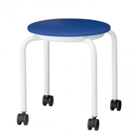| キャスターがついて移動が簡単な抗菌・防汚・難燃・耐次亜塩素酸・耐アルコール機能対応張地の丸椅子です。4脚までは平積み可能です。 |