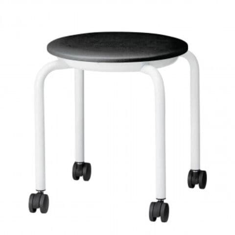 | キャスターがついて移動が簡単な抗菌・防汚・難燃・耐次亜塩素酸・耐アルコール機能対応張地の丸椅子です。4脚までは平積み可能です。 |