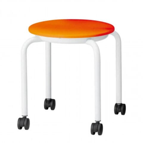 | キャスターがついて移動が簡単な抗菌・防汚・難燃・耐次亜塩素酸・耐アルコール機能対応張地の丸椅子です。4脚までは平積み可能です。 |