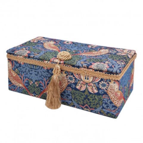 | ジェニファーテイラーとウィリアムモリスのデザインのコラボ。イチゴ泥棒の織生地が高級感を演出します。ジュエリーボックスは、上段に指輪やイヤリングなどの小物、下段には大きめのものが収納できます。上段を外してリモコン収納や小物入れとして使うこともできます。 |