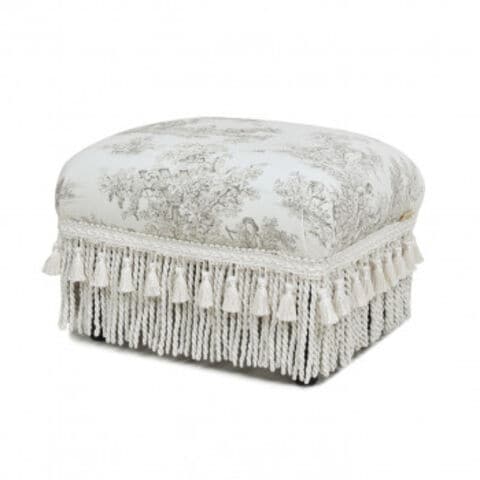 | ジェニファーテイラーが選んだフランス製の「トワル ド ジュイ」は、白地にグレージュでフランスの裕福な田園風景を描いています。フットスツールには大柄で強度のある生地を使用しています。リビング、玄関などで活躍してくれるフットスツールです。 |