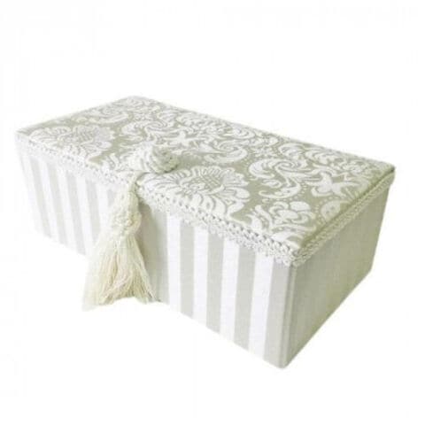 | コンパクトなボディーながら2段重ねで大容量を実現。取り外し可能なリングトレイと仕切り付トレイも機能的です。ダマスク模様とストライプのコンビネーションは、洗練された上質感が漂います。 |