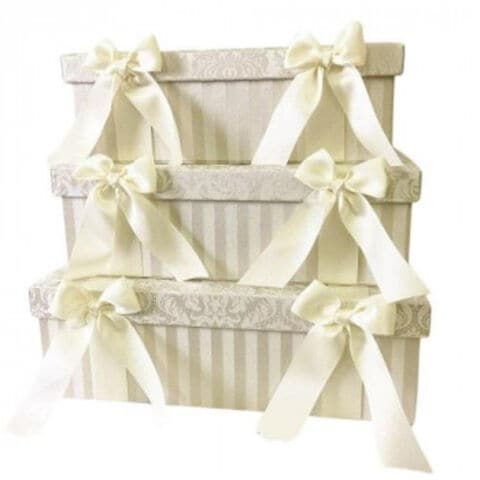 | ダマスク模様とストライプのコンビネーションは、洗練された上質感が漂います。リボンを使いエレガントで高級感の有るデザインと実用性を兼ね備えています。大中小の3個セットで入れ子になります。すべて中も生地貼りです。 |