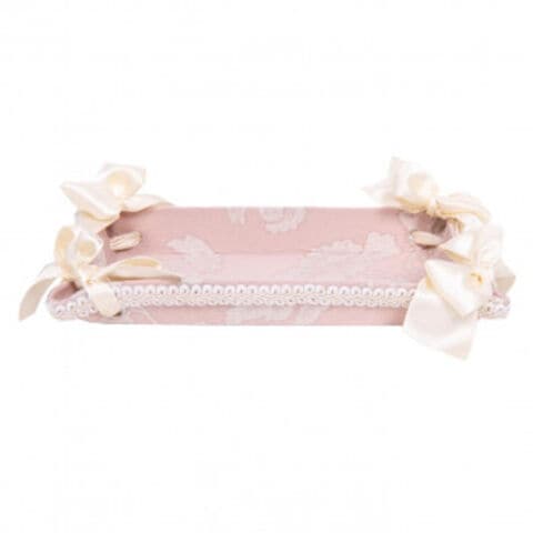 | 落ち着いたピンクジャガードファブリックは、フェミニンでありながら上質感が漂います。こちらは実用的なトレーです。腕時計やアクセサリーを外した時に入れるだけでお片付け完了。スマホにも丁度良いサイズです。4隅のリボンがチャームポイント。ヘアルームピンクのジャガード生地がフェミニン感を演出します。 |