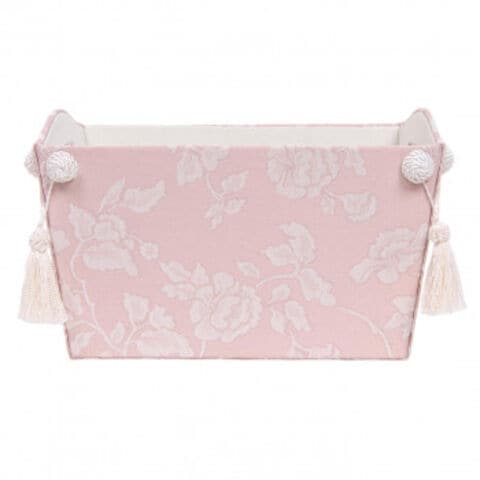 落ち着いたピンクジャガードファブリックは、フェミニンでありながら上質感が漂います。4隅にタッセルをあしらっていてとてもエレガントなデザインです。中も生地貼りなので丈夫でとても実用的です。雑誌や新聞の収納にはもちろん、小物入れにも便利です。また、お客様用のスリッパを入れて、スリッパラックにもおすすめです。