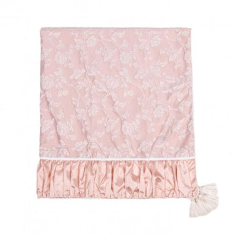 | 落ち着いたピンクジャガードファブリックは、フェミニンでありながら上質感が漂います。ソファーに掛けたりテーブルクロスとしてお使い頂けます。両端の生地を切り替え、4方にタッセルが付いています。裏地付きです。 |