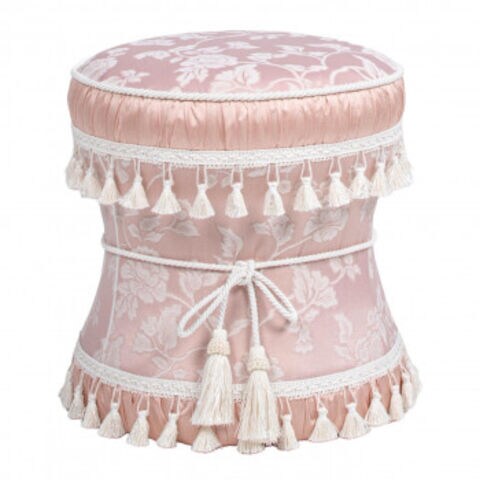 落ち着いたピンクジャガードファブリックは、フェミニンでありながら上質感が漂います。リビング、玄関などで活躍してくれるかわいい丸型のスツール。生地とタッセルのコンビネーションが美しく、小物と合わせるとサロンのような空間になります。