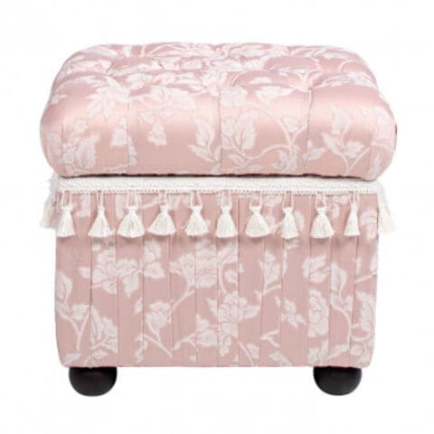 | 落ち着いたピンクジャガードファブリックは、フェミニンでありながら上質感が漂います。リビング、玄関などで活躍してくれる便利な収納スツール。生地とタッセルのコンビネーションが美しく、小物と合わせるとサロンのような空間になります。 |