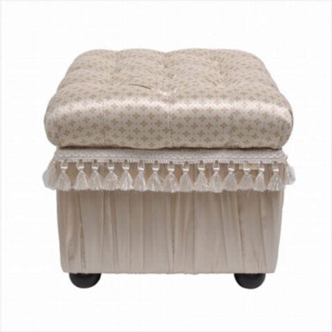 | 人気の秘密は女性の心を擽るタッセルやフリンジを使いエレガントで高級感の有るデザインと実用性を兼ね備えた商品。こちらのスツールは上品なオフホワイトで、インテリアのコーディネイトも合わせやすいです。座面もしっかりとした作りで、適度なクッション性と安定感が有り座り心地もバッチリ。普段使用されているアームチェアの足おきや玄関でブーツを履く際に使用されても便利です。蓋を開けて中に収納出来るため機能的です。 |
