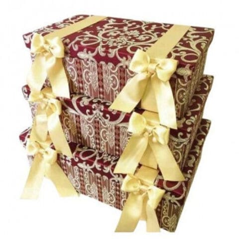 | イタリアの伝統的なアラベスク模様を施した深い赤の布地を使い、クラシックで落ち着いた仕上がりが印象的です。人気の秘密は女性の心を擽るリボンを使いエレガントで高級感の有るデザインと実用性を兼ね備えた商品にあります。大中小の3個セットで入れ子になります。すべて中も生地貼りです。 |