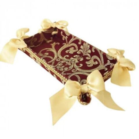 | イタリアの伝統的なアラベスク模様を施した深い赤の布地を使い、クラシックで落ち着いた仕上がりが印象的です。人気の秘密は女性の心を擽るリボン使い。エレガントで高級感の有るデザインと実用性を兼ね備えた商品にあります。トレー内側も側面と同じ生地張りです。 |