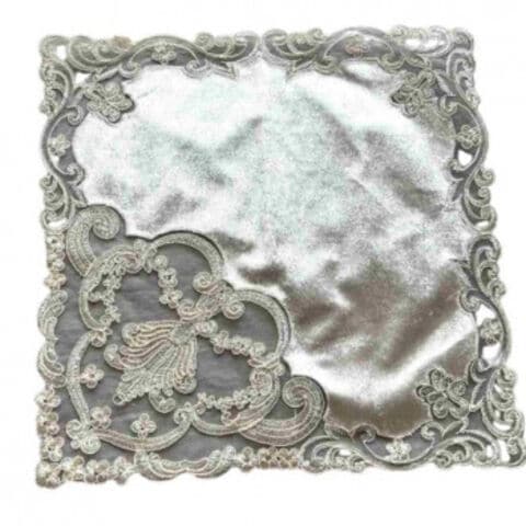 | 淡いベージュ系ニュアンスカラーの色のベロア生地が上品なテーブルセンター。小ぶりなサイズで花瓶等の敷物や小物の上に掛けて目隠し等、色々な場所でお使い頂けます。 |