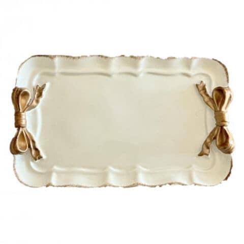 | ゴールドのコンビネーションとリボンデザインのかわいいトレイです。ティーカップを運ぶのにちょうど良いサイズです。プリンセスなデザインはドレッサーやパウダールームにもぴったり。程よい重さで、高級感があります。樹脂製です。 |