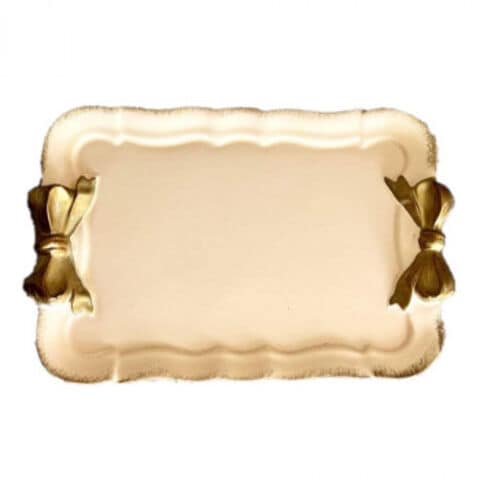 | ゴールドのコンビネーションとリボンデザインのかわいいトレイです。ティーカップを2客運ぶのにちょうど良いサイズです。プリンセスなデザインはドレッサーやパウダールームにもぴったり。程よい重さで、高級感があります。樹脂製です。 |
