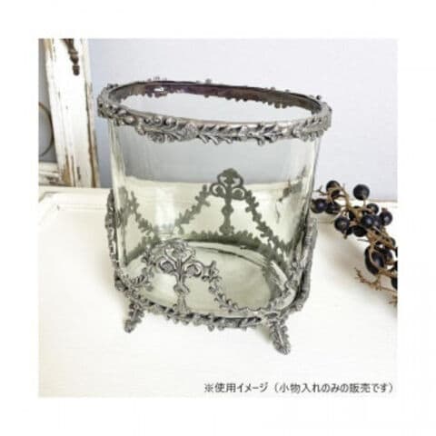 | BRASS(真鍮)をアンティークシルバーに仕上げた重厚感・高級感のあるクラシックなガラスの小物入れです。側面のレリーフや取手も美しいデザインです。花器にもおすすめです。 ※アンティーク調仕上げの為、多少の小傷、凹凸、個体差がございます。 |