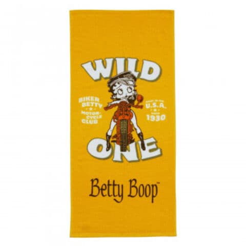 | バイクに乗ったワイルドなベティが描かれたシャーリング染料プリントのフェイスタオルです。 |