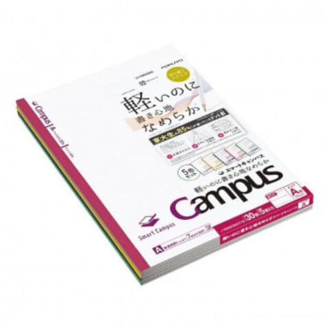 | うすくて軽いキャンパスノート「スマートキャンパス」。うすいのに裏うつりしにくく、なめらかに書けます。従来のキャンパスノートより平滑度の高い紙を使用しており、書き心地なめらかです。5色セットのパックノートです。 |