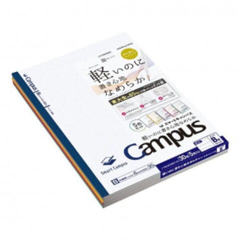 | うすくて軽いキャンパスノート「スマートキャンパス」。うすいのに裏うつりしにくく、なめらかに書けます。従来のキャンパスノートより平滑度の高い紙を使用しており、書き心地なめらかです。5色セットのパックノートです。 |