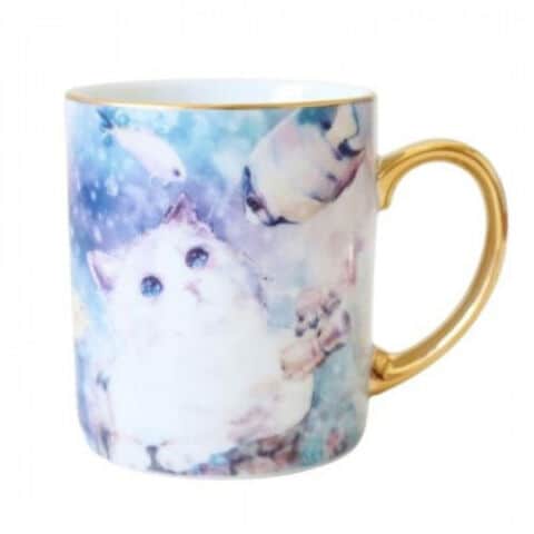 ネコたちの不思議な日常を描いた絵日記「kyou wa donna hi?」のマグカップ。ゴールドの持ち手と縁取りがより華やかな雰囲気を演出しています。淡い水彩タッチのイラストはゆったりとしたティータイムのひとときにもぴったりです。