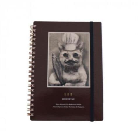 偉大なシェフ猫の肖像画がモチーフのリングノート。ベルトが付いているので持ち運びに最適です。大人可愛いシックな色合いと金色に輝くお魚型の箔押しがポイントです。