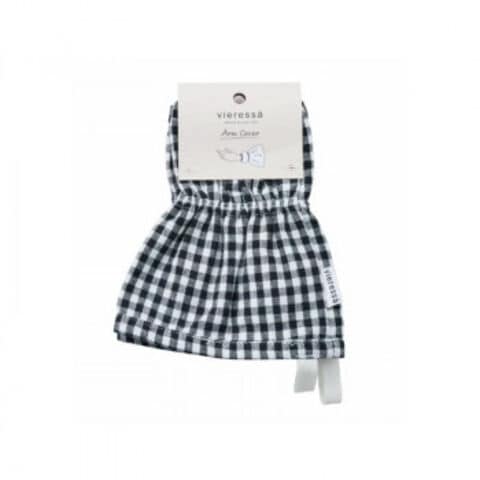 シンプルなギンガムチェックのショート丈のアームカバーです。水廻りのお仕事はもちろん、ガーデニングや事務作業の際に便利なアームカバーです。ショート丈なので手軽につけやすく、裾をもって引き上げれば、サッとそでをまくる事が出来ます。裾にループを取りつけているので、使っていないときはフックなどに吊り下げることが出来ます。また、使用後に吊るして乾かすことも出来ます。