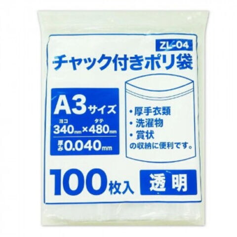 チャック付きポリ袋 A3サイズ 食品検査適合商品 ZL-04 透明 100枚×8冊