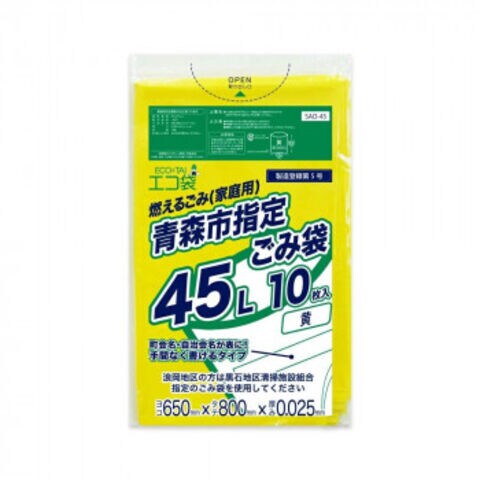 ECO TAI エコ袋 燃えるごみ(家庭用)青森指定ごみ袋45L SAO-45 イエロー 10枚×70冊