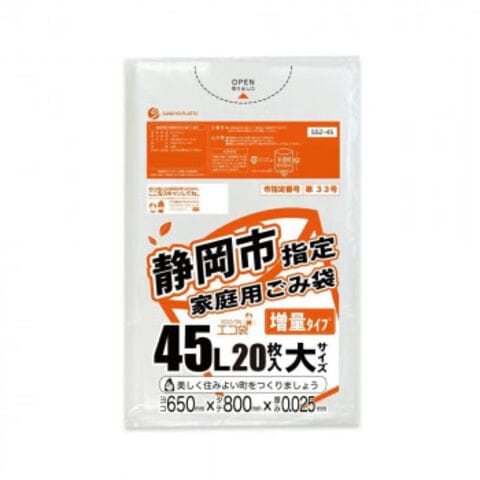| 静岡市指定家庭用ごみ袋です。1冊20枚入りの増量タイプです。0.025mm厚で、引っ張りに強く省資源でありながら強度も兼ね備えた商品です。45Lペールに適した大きさです。 |