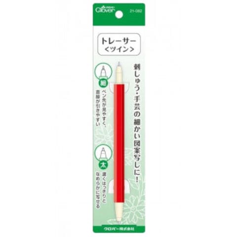 細・太のツインタイプのトレーサーです。ペン先には、図案や複写紙を破りにくく、なめらかに写せるボールチップを採用しています。細は写したい図案が見やすい形状で、また、直線を引く際にも定規に当てやすくなっています。太は濃くはっきりとなめらかに写せます。ペン軸は転がりにくく持ちやすい六角形の形状です。