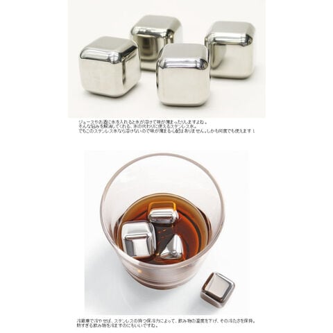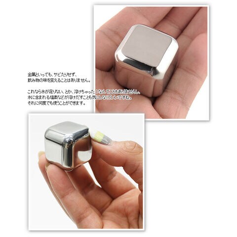 | 紹介 | 溶けない! 何度も使える! この夏はステンレスの氷を 冷凍庫や冷凍庫で冷やせば、ステンレスの持つ保冷力によって、飲み物の温度を下げ、その冷たさを保持してくれるのだそう。 熱すぎる飲み物を冷ますのにもいいですね。 サビたりせず、飲み物の味を変えることはありません これなら氷が足りない、とか、溶けちゃった!なんてこともありませんし、氷に含まれる塩素などが溶けだすことも気にしなくていいですね。それに何度でも使うことができます。 |