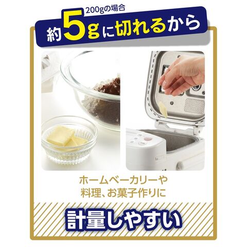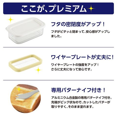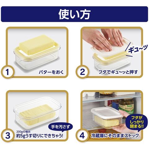 | ギュッと一押しで、バターを使いやすい約5gの薄切りに簡単カット! 冷蔵庫にそのまま保存できるバターケースです☆ ●フタがピタッと閉まって安心感◎ ●ワイヤープレートの強度がアップ、さらに丈夫に! ●ホームベーカリーやお料理、お菓子作りに! 計量しやすく便利です♪ ●薄くカットで溶けやすい トーストなどにのせれば溶けやすく美味しく召し上がって頂けます。 ●アルミニウム合金製の専用バターナイフ付き 先端がピック状なので、カットしたバターが取りやすく、そのまま塗れます。