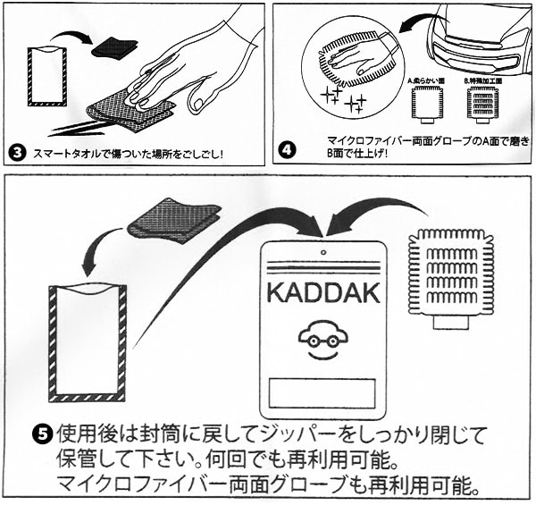 | ◆使い方はかんたん! 車体についたホコリなどをよく乾いたタオルであらかじめきれいに拭きとります。 あとは、KADDAKスマートタオルでキズや汚れのある部分をゴシゴシ磨き上げるだけ! 磨いた後、磨いた部分に残った液体を拭き取れば完了! 道具や洗剤を用意する必要はありません。 水で流す手間も無く、ちょっと気になったらパパっとお手入れできるのでラクラク♪ |