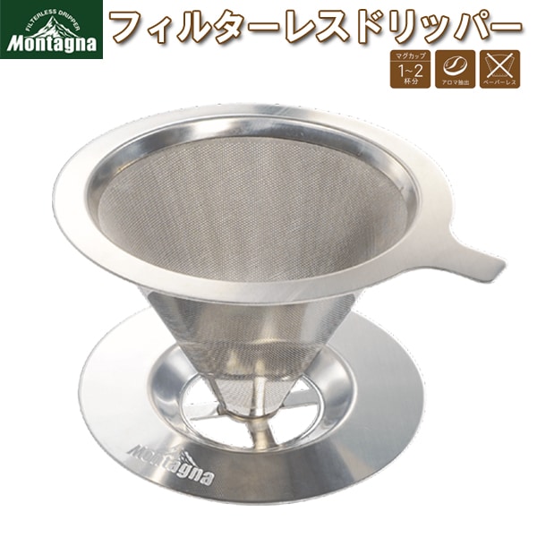 送料無料 ! Montagna モンターナ コーヒードリッパー ステンレス製 二重構造 ペーパーレス 本来の味わい 1~2杯分 ( コーヒー 珈琲 ドリッパー スタンド一体式 カフェ アウトドア キッチン ) 当店イチオシ 送料込 150T◇ モンターナフィルターレス