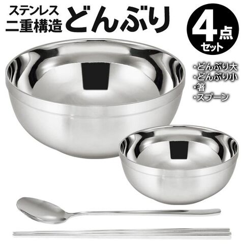 | 温冷対応 二重構造 どんぶり大・小 +箸+スプーン ステンレス食器 4点セット |