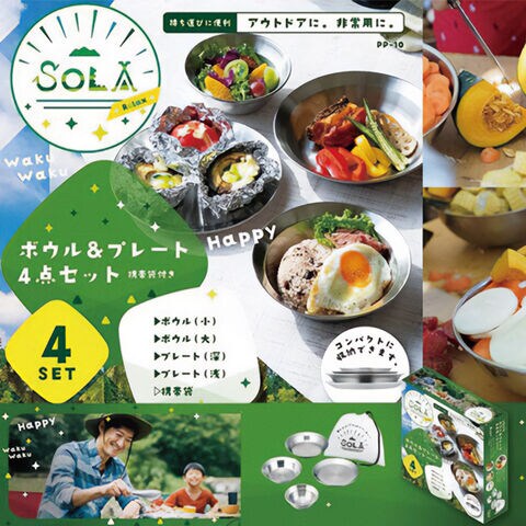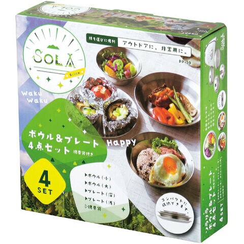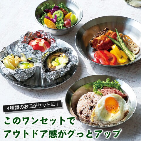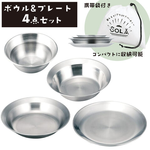 アウトドア食器 4種類セット ステンレス製 ボウル&プレート 重ねて収納 携帯袋付き【 金属製 キャンピング お皿 深皿 浅皿 コンパクト 軽量 丈夫 キャンプ 釣り アウトドア飯 1人用 新着!】 /60N◇ ソラリラ4点セット