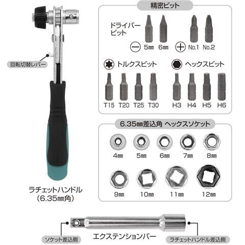 | 主材質 | 精密ビット・ヘックスソケット・エクステンションバー:炭素鋼 ラチェットハンドル:炭素鋼・PP・TPR 専用ケース:ABS・PS・PE・TPR |